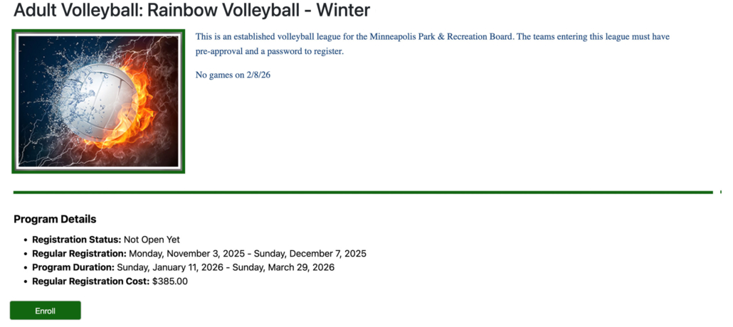 1. Go to the Minneapolis Park and Recreation Board page here: https://www.teamsideline.com/sites/minneapolisparks/program/96410/Adult-Volleyball-Rainbow-Volleyball-Winter